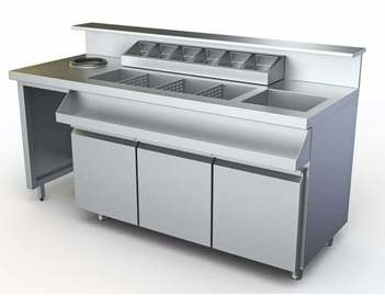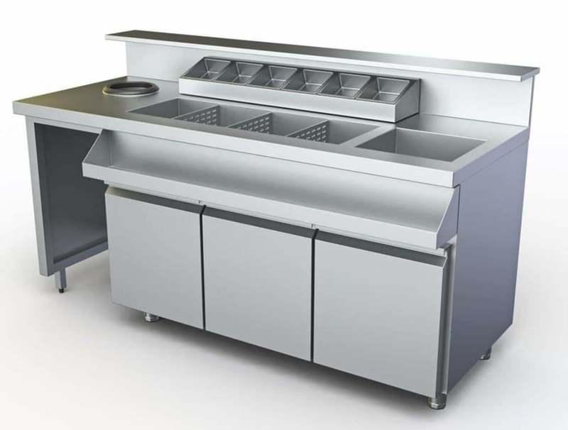 Κατασκευασμένο από ανοξείδωτο ατσάλι AISI 430 ή προαιρετικά από AISI 304. Οι ουδέτερες κατασκευές, με ή χωρίς συρόμενες πόρτες, έχουν κεντρικά ράφια ρυθμιζόμενα σε ύψος.
