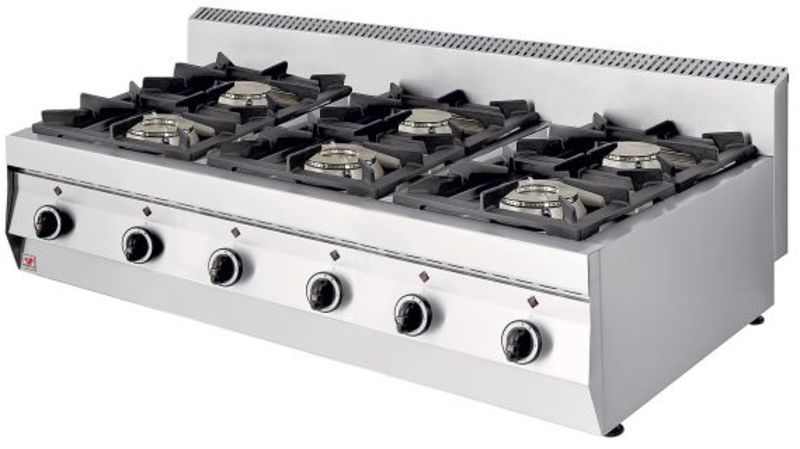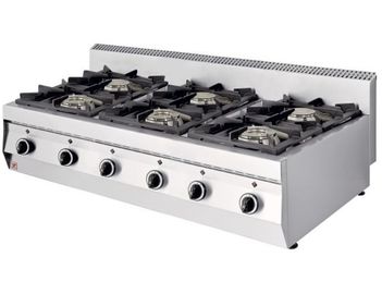 | Επιτραπέζια φλόγηστρα υγραερίου με 6 μαντεμένιους καυστήρες. Αποσπόμενη λεκάνη περισυλλογής υπολυμάτων. Σχάρες βαρέου τύπου μαντεμένιες. Με πιλότο και θερμοκόπια. |