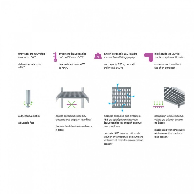 - Αντοχή σε φορτίο 150 Kg ανά ράφι και συνολικά 600 Kg ανά ραφιέρα.