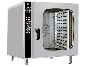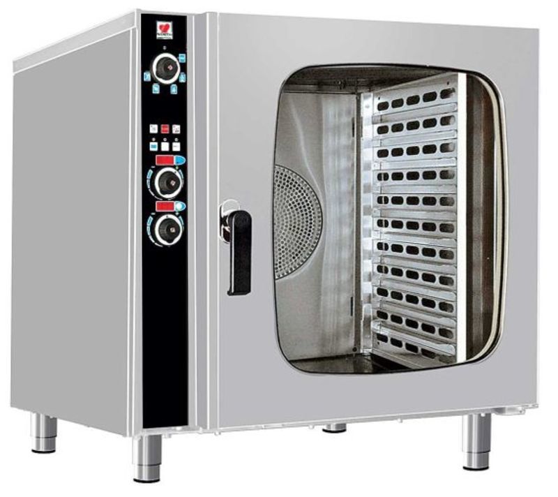 Ηλεκτρικός φούρνος αέρος με boiler. Ηλεκτρονικός θερμοστάτης και χρονοδιακόπτης. Επιλογές 5 προγραμμάτων, ένδειξη service και καθαρισμού. 10 θέσεων 60 x 40 cm ή με αλλαγή της βάσης 10 GN 1/1.