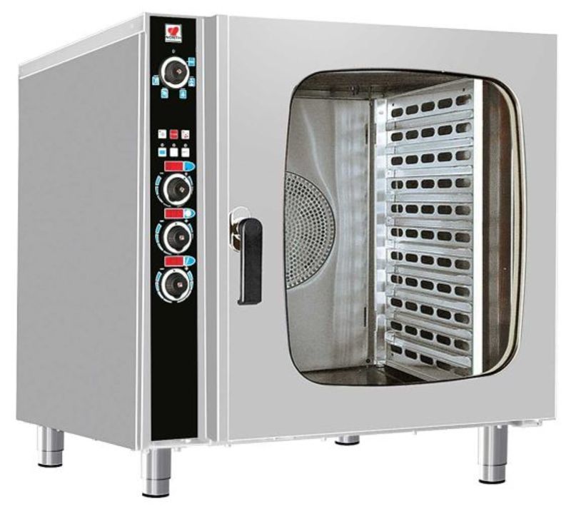 Ηλεκτρικός φούρνος αέρος ατμού με boiler. Ηλεκτρονικός θερμοστάτης. Χρονοδιακόπτης και αισθητήριο καρδιάς. Επιλογές 5 προγραμμάτων, ένδειξη service και καθαρισμού. 10 θέσεων GN 1/1 ή με αλλαγή της βάσης 10 60 x 40 cm.
