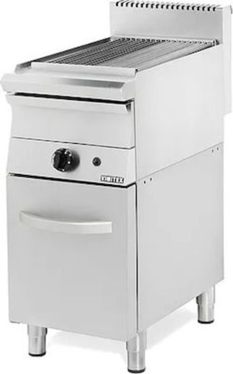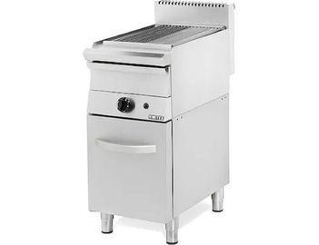 Επαγγελματικό, επιδαπέδιο γκριλ αερίου με 1 πολύ ισχυρό καυστήρα μεγάλης απόδοσης. Απαιτεί ελάχιστο χρόνο προθέρμανσης και προσφέρει εξαιρετική ταχύτητα και ποιότητα ψησίματος. Διαθέτει ερμάριο βάσης (ανοιχτό η κλειστό κατ’ επιλογή) για επιπλέον αποθήκευση. Ιδανική συσκευή για όλα τα είδη κρέατος, ψαριού και λαχανικών. Για τα λιπαρά κομμάτια (μπριζόλες, πανσέτες, μπιφτέκια και λουκάνικα) προτείνεται η σχάρα τύπου "V" , ενώ για τα κοτόπουλα προτείνεται η σχάρα τύπου "S". Ο καυστήρας είναι μελετημένος ώστε να διανέμει ομοιόμορφα τη θερμοκρασία στην επιφάνεια ψησίματος, εξασφαλίζοντας μεγαλύτερη απορρόφηση της ενέργειας χωρίς απώλειες, και επομένως μειωμένο κόστος μαγειρέματος. Το περιστροφικό κουμπί προοδευτικής αυξομείωσης της φλόγας πετυχαίνει απόλυτο έλεγχο της θερμοκρασίας επάνω στην σχάρα για άψογο αποτέλεσμα σε κάθε είδος ψησίματος. Η ανάφλεξη και η επίβλεψη της φλόγας γίνεται με πιεζοηλεκτρικό αναπτήρα και πιλότο, τοποθετημένα σε απόλυτα προστατευμένο σημείο από λίπη και λάδια στο μπροστινό μέρος της συσκευής για εύκολη πρόσβαση.